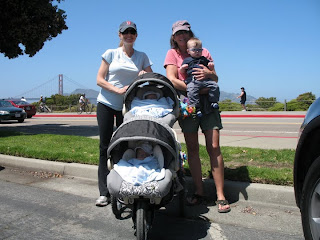 Now that the boys have hit the 5-week mark (side note, they're also almost 8 pounds now!!!), I'm trying to work a bit more normalcy into life. The first weeks were learning to feed (still working on that), recovering, and thinking oh-my-God-we're-parents (still thinking that and loving it). Yesterday the boys, Leanne, Wonder and I did one of my all time favorite things - hang with good friends and get outside moving! The boys loved walking along Chrissy Field, and so did the moms.